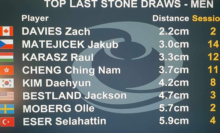 Nedělní dopoledne trávíme na ledě na jedné dráze s Korejci. Asijský tým, ve kterém nechybí ani obligátní Kim či Lee, se zatím prezentoval velmi dobře, porazil Maďary a kromě Švédů (4:5) i všechny ostatní týmy a zatím stál na postup. My jsme potřebovali hodit skvělé LSD, ale to se nezdařilo. Korejci však byli nakonec ještě horší, a tak jsme měli výhodu do prvního endu. Po LSD jsme tušili, že ani vítězství nás pravděpodobně na postupové příčky neposune. Aby, byť jen teoreticky, nějaká naděje existovala, potřebovali jsme určitě výhru. Bylo to utkání, ve kterém ani jeden z týmů neskóroval víc než jedničkou, ale my jsme to zvládli celkem pětkrát, a to stačilo. Odpoledne jsme se byli podívat na vývoj zápasů v jiných skupinách, ale žádné pomoci od nikoho dalšího jsme se nedočkali. Večer, s Ondrou na skipovi a s Jakubem na jedničce jsme rozdrtili Rumuny, ale výsledky na ostatních drahách nebyly příznivé. Končíme čtvrtí ve skupině, což je pro nás velké zklamání. Umístění určitě neodpovídá kvalitě týmu, a to ani v porovnání s družstvy z ostatních skupin. Prakticky ve všech dostupných statistikách jsme na tom velice dobře. Až na DSC. To rozhodlo. Z naší skupiny postupují Švédové a Maďaři. Z ostatních Japonsko, Kanada, Nový Zéland, Dánsko, USA a Ukrajina. Korejci nakonec minuli čtvrtfinále na DSC o 31 milimetrů. Můžeme jenom do nekonečna rozebírat závěr zápasu proti Švédům, kdy nám o vlas – a to možná doslova - uteklo vítězství, které by nás nakonec bývalo vyneslo na první místo ve skupině. Kluci se v turnaji rvali do poslední chvíle a zaslouží si uznání za víc než důstojnou reprezentaci. Vít Chabičovský, Ondřej Bodlák, Kryštof Žďárský, David Škácha a Jakub Matějíček odvedli dobrou práci, ukázali kvalitu a mají dál na čem stavět. Dík za pomoc patří Wadu Scoffinovi, Ondřeji Bodlákovi staršímu a všem, kteří tým podpořili.
